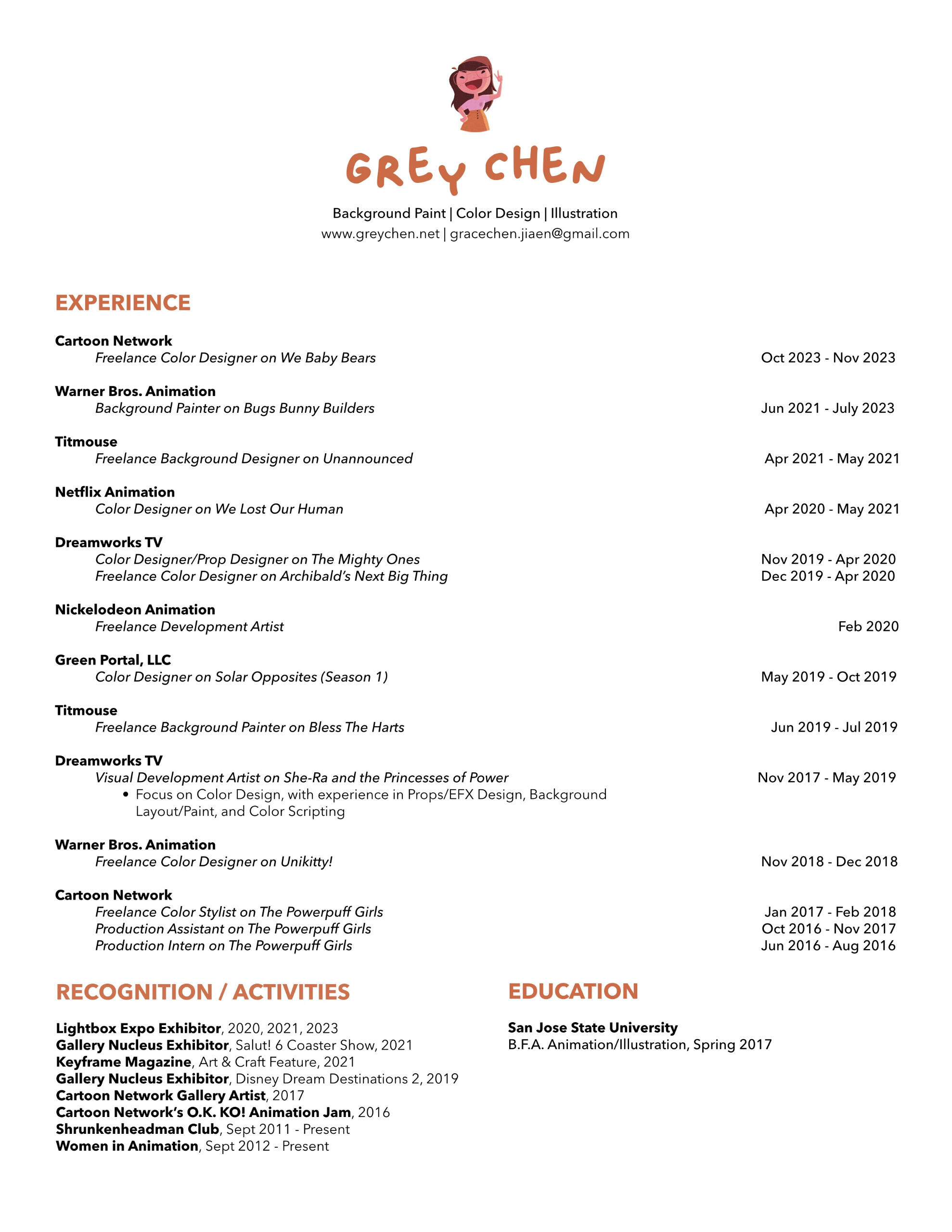 Straight Ahead Podcast Guest Speaker, Fall 2021Studios: Netflix Animation, Green Portal LLC, DreamWorks TV, Warner Brothers, Cartoon Network, Nickelodeon Animation, Titmouse Inc.Current Availability: Open for Full-Time Freelance!